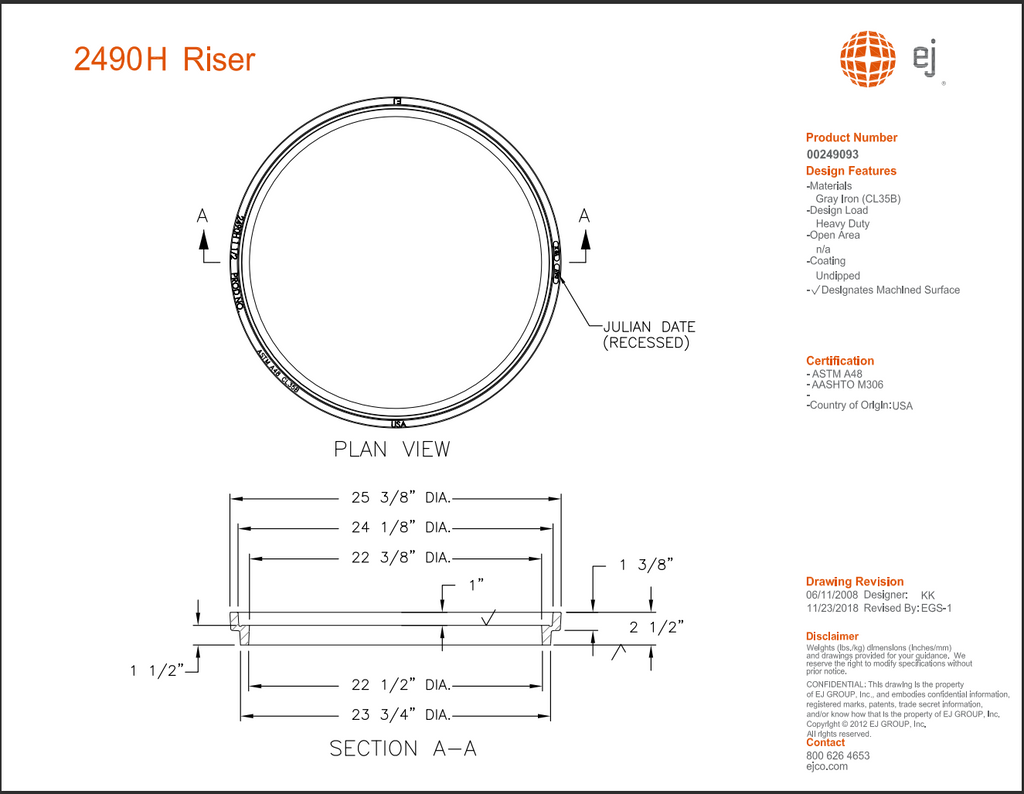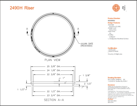 This 2490 Series round gray iron riser fits a 23.875" diameter cover with a 1" seat thickness. It fits into your existing frame to elevate your manhole or catch basin by 1.5" and bring it to the finished grade.