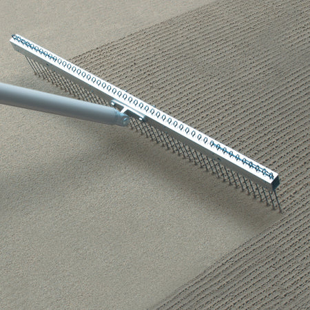 A popular tool to creates non-skid surfaces on highways, bridges, airport runways, ramps, driveways, and cattle pens. The Flat Wire Texture Broom produces a uniform rough groove surface on roads and bridges for maximum traction to prevent planing and to keep water flowing off the road. In addition to traction and drainage surface tining helps diminish the noise pollution created with traffic. The snap-out, snap-in replaceable tines are blue spring steel. The .28" thick tine is stiff enough to create groove but provides a slight "give" for durability. The standard exposed length, extending from comb head, is 5" in length by 1/8" in width. Tine spacing of 3/4" between the center of a tine to the center of the next tine. Check with your local Department of Transportation (DOT) for spacing requirements on specific jobs. The 36" long broom has an attached clevis bracket. Use with a clevis handle or an adapter for use with bull-float handles; all handles sold separately.
