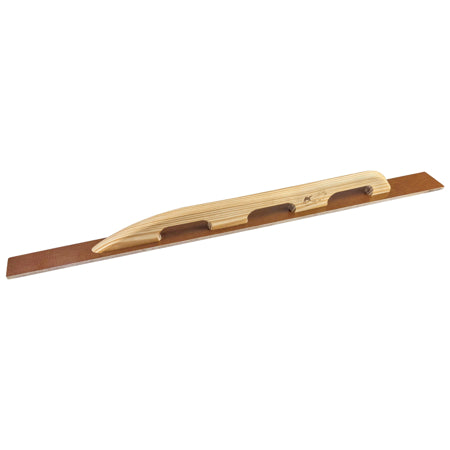 This tapered darby is made from long-wearing laminated canvas-resin for a durable 3/8" thick blade. The 45" blade tapers from about 3-1/2" at the heel to 2-1/2" at the toe for a smooth final finish. The tapered blade makes it easier to move across the top of concrete slabs with one hand. The "broken-in" shape of the blade makes surface prep easy. The square end darby has rounded corners to prevent potential gouging of material. The resin doesn't soak up water like wood after repeated use and cleanings. A 32" long smooth wood handle is attached to the blade to give support. Three hand holes within the handle allows for a variety of hand configurations for pushing, pulling, or one-handed sweeping motions. This darby is popular with concrete finishers and those working in decorative concrete.