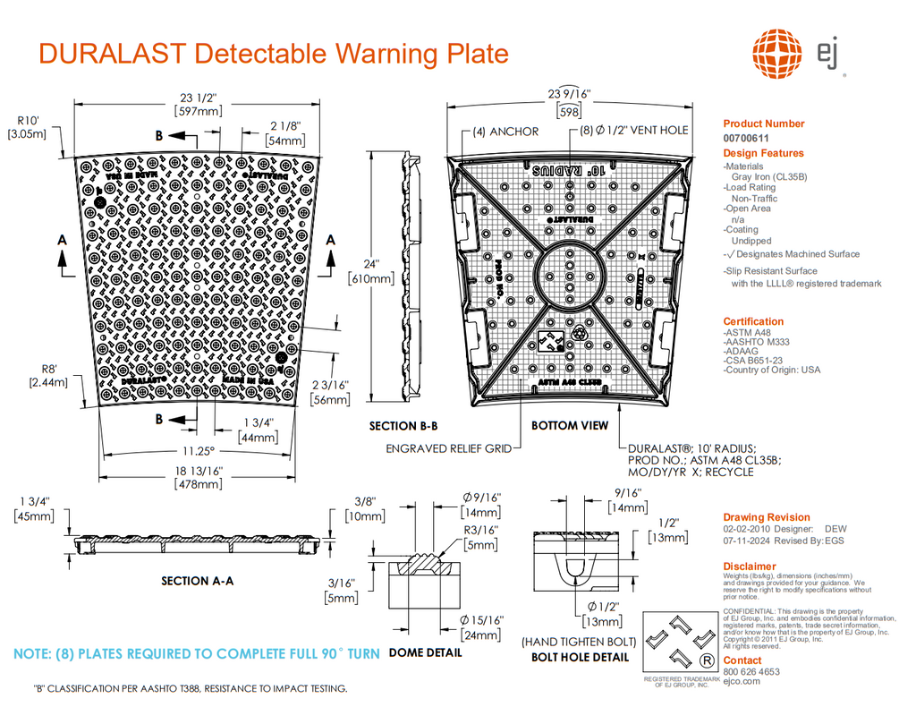 DURALAST® Detectable Warning Plates help warn the blind or visually impaired of the approaching street. This long-lasting cast iron product is easy to install and maintenance free. This 10' radial design is designed to fit your curbline without the need to cut any plates on-site.
