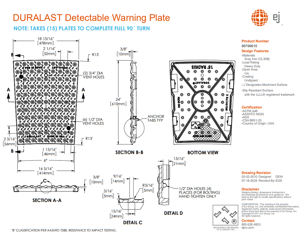 DURALAST® Detectable Warning Plates help warn the blind or visually impaired of the approaching street. This long-lasting cast iron product is easy to install and maintenance free. This 15' radial design is designed to fit your curbline without the need to cut any plates on-site.