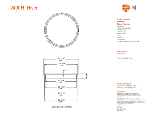 This 2490 Series round gray iron riser fits a 23.875" diameter cover with a 1" seat thickness. It fits into your existing frame to elevate your manhole or catch basin by 3" and bring it to the finished grade.