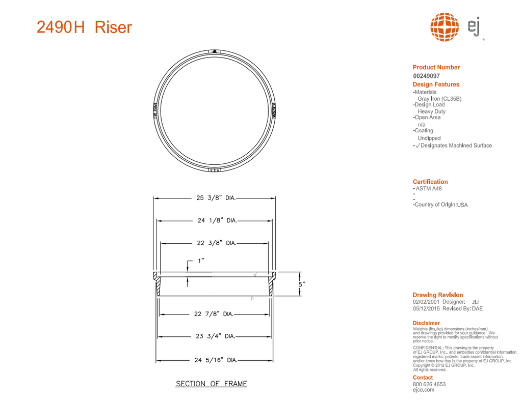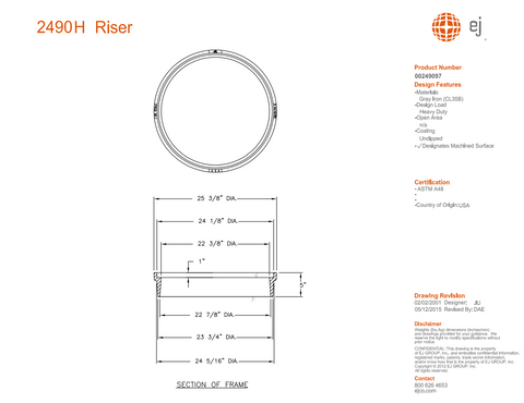 This 2490 Series round gray iron riser fits a 23.875" diameter cover with a 1" seat thickness. It fits into your existing frame to elevate your manhole or catch basin by 4" and bring it to the finished grade.
