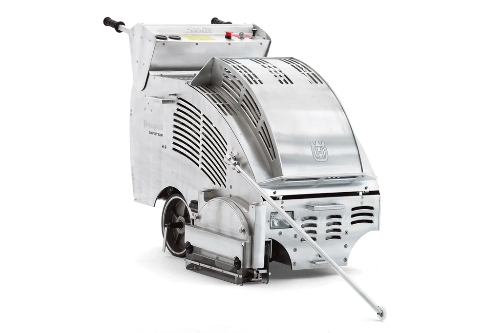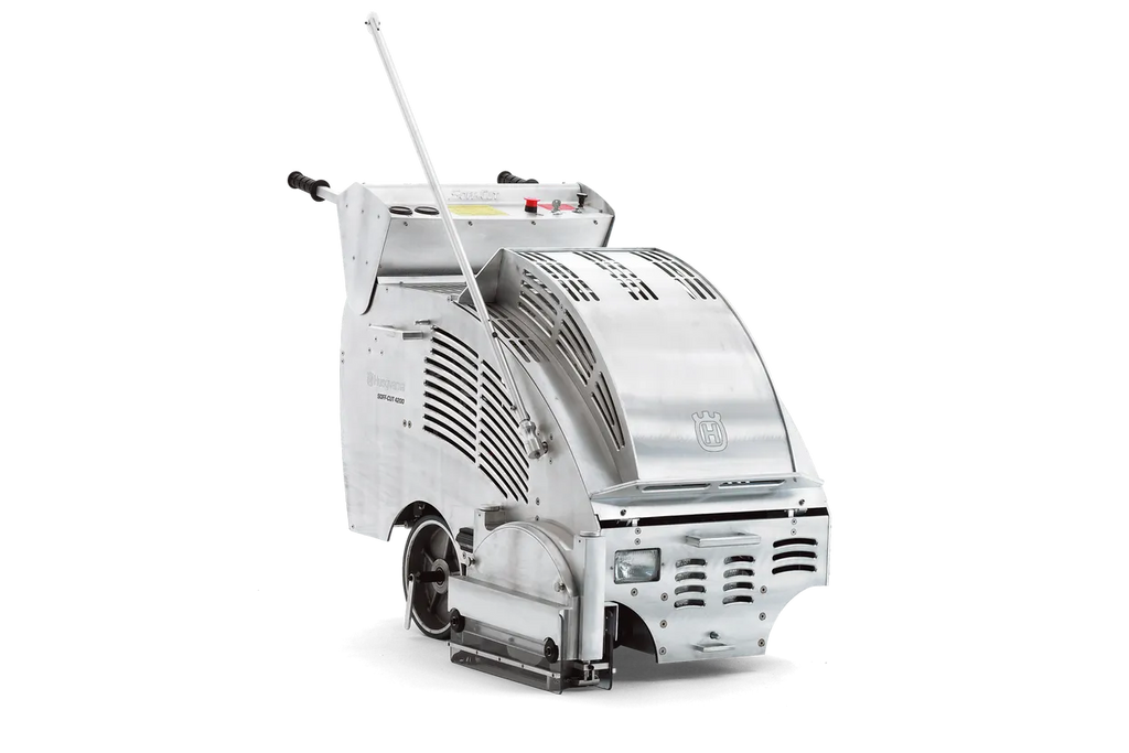 The Husqvarna 4200 self-propelled dry-cutting gasoline saw has a low-noise enclosed design and is ideal for heavy-duty commercial, industrial and paving applications. The 4200 is designed for peak performance. Features include a 23 hp twin-cylinder gasoline engine, three-stage cyclonic air cleaner, oil cooler, full-pressure oil lubrication, hydraulic valve lifters, mechanical fuel pump and oil alert light. Multiple blade widths can be used, allowing different joint widths and crack control simultaneously.