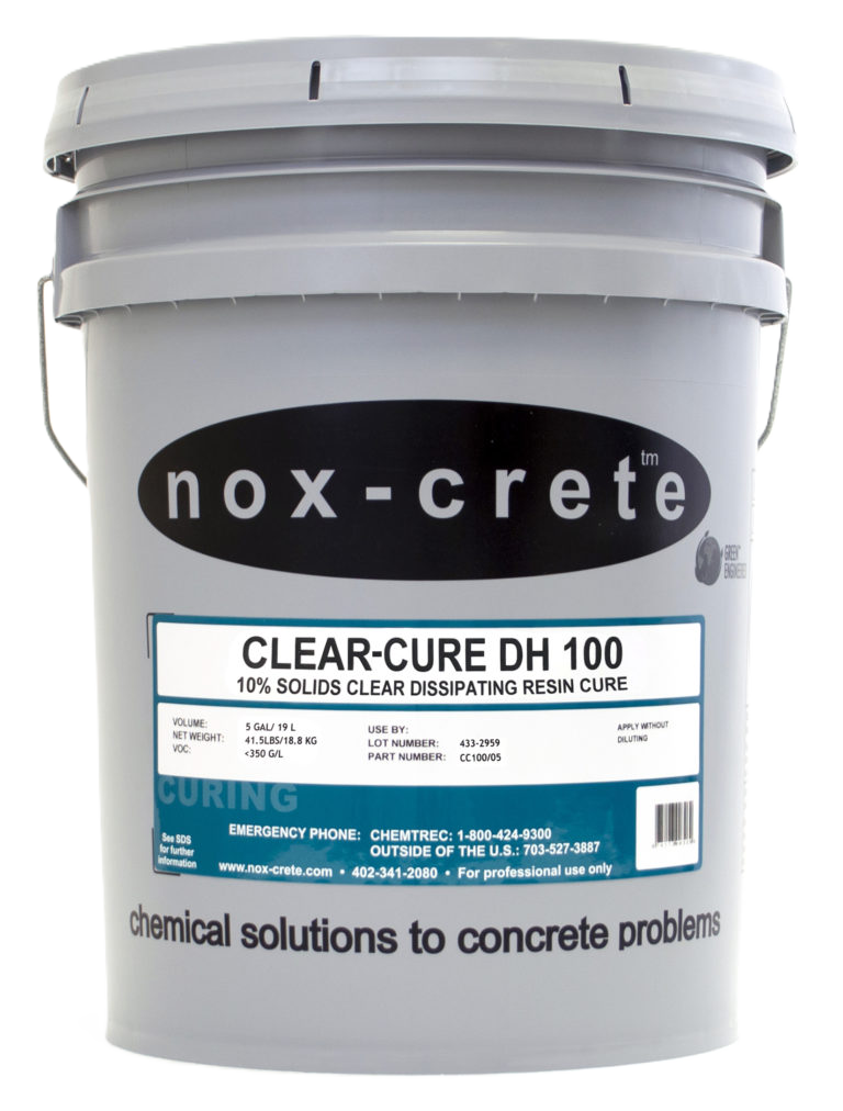 Clear-Cure DH horizontal concrete curing compound is Nox-Crete's new clear, water-based, dissipating hydrocarbon resin-type formula. Clear-Cure DH offers high performance without waxes, paraffins, gums or oils. When applied to the surface of freshly place concrete, Clear-Cure DH rapidly forms a moisture vapor resistant membrane. It prevents the rapid evaporation of concrete mixing water, allowing concrete to properly cure and develop strength.