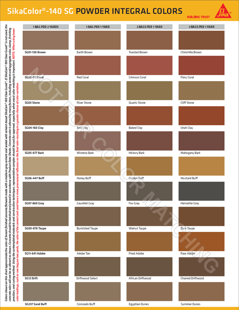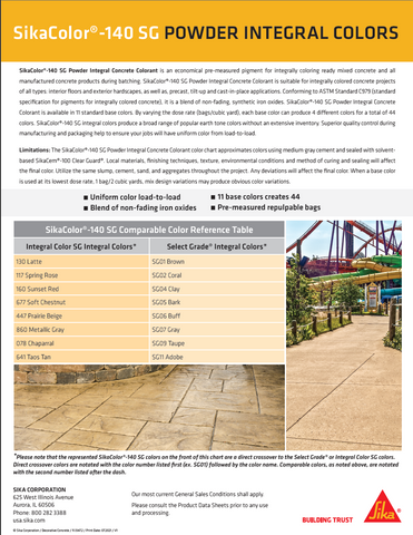 SikaColor®-140 SG Granular Integral Color is a cost-effective means to permanently color concrete and other cementitious materials. It is packaged in easy-to-use disintegrating bags that can be used to make standard colors or mixed to develop hundreds of permanent color variations.