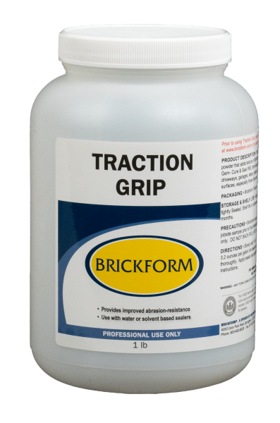 Traction Grip is an anti-slip micronized powder that adds texture to decorative sealers (Brickform Gem-Seal and Poly-Seal). The lightweight, spherical shape and clarity gives Traction Grip its specific properties. Applications include inclined driveways, garages, steps, patios and pool decks.